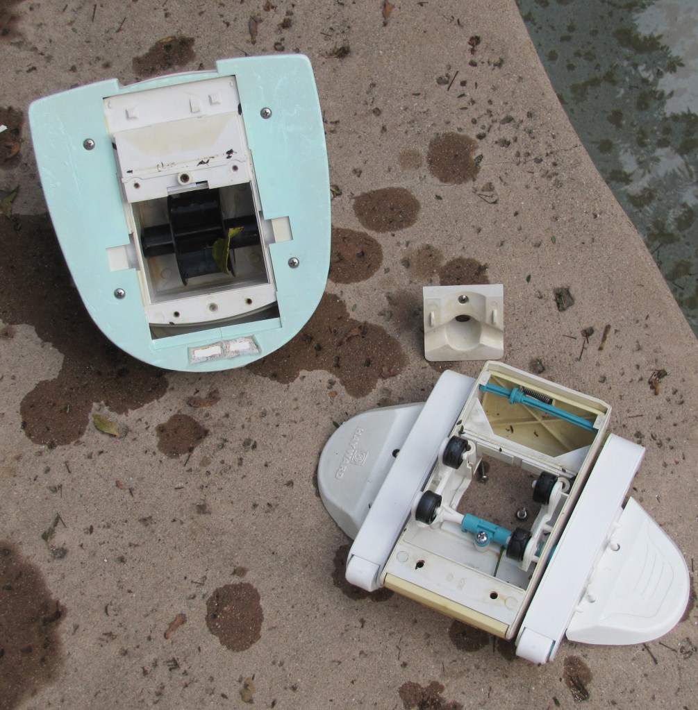 Now remove the (4) screws that hold the chassis in place. There are two kind of hidden under the front flapper. Lift the chassis off of the Pool Vac.