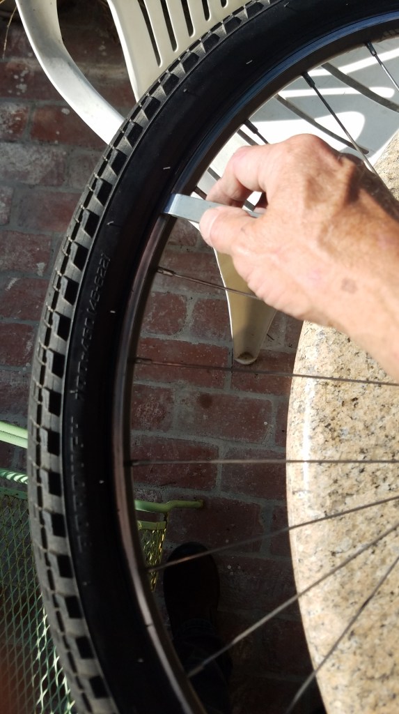 You can fit the tire back into the rim with your fingers most of the way around, but you’ll eventually need to use the screwdrivers to pop it over the edge.
